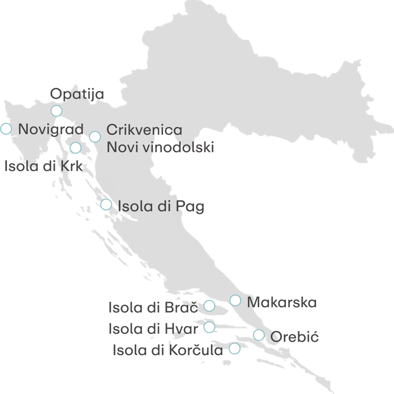 Dalle idilliache coste dell'Istria, passando per la bellezza del Quarnero, fino alle perle nascoste della Dalmazia, ogni destinazione racconta la sua storia. Sia che decidiate di rilassarvi sulle spiagge assolate, passeggiare per i centri storici o esplorare le bellezze naturali, le destinazioni Aminess garantiscono la perfetta combinazione di relax ed esperienza autentica.