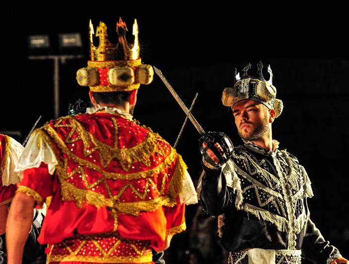 Een ridderlijk zwaarddansspel, een traditionele dans die al generaties lang wordt doorgegeven.